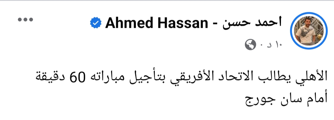 وكتب أحمد حسن عبر حسابه الخاص بموقع التواصل الاحتماعي “تويتر”: “الأهلي يطالب الاتحاد الأفريقي بتأجيل مباراته 60 دقيقة أمام سان جورج”.