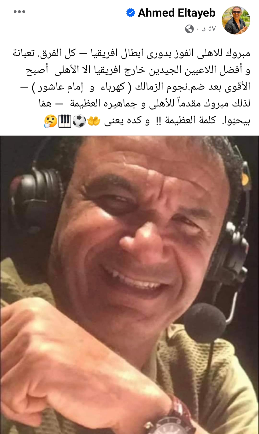 وكتب الطيب عبر حسابه الخاص بموقع التواصل الاجتماعي “فيس بوك”: “مبروك لـ الاهلى الفوز بدورى أبطال أفريقيا”.