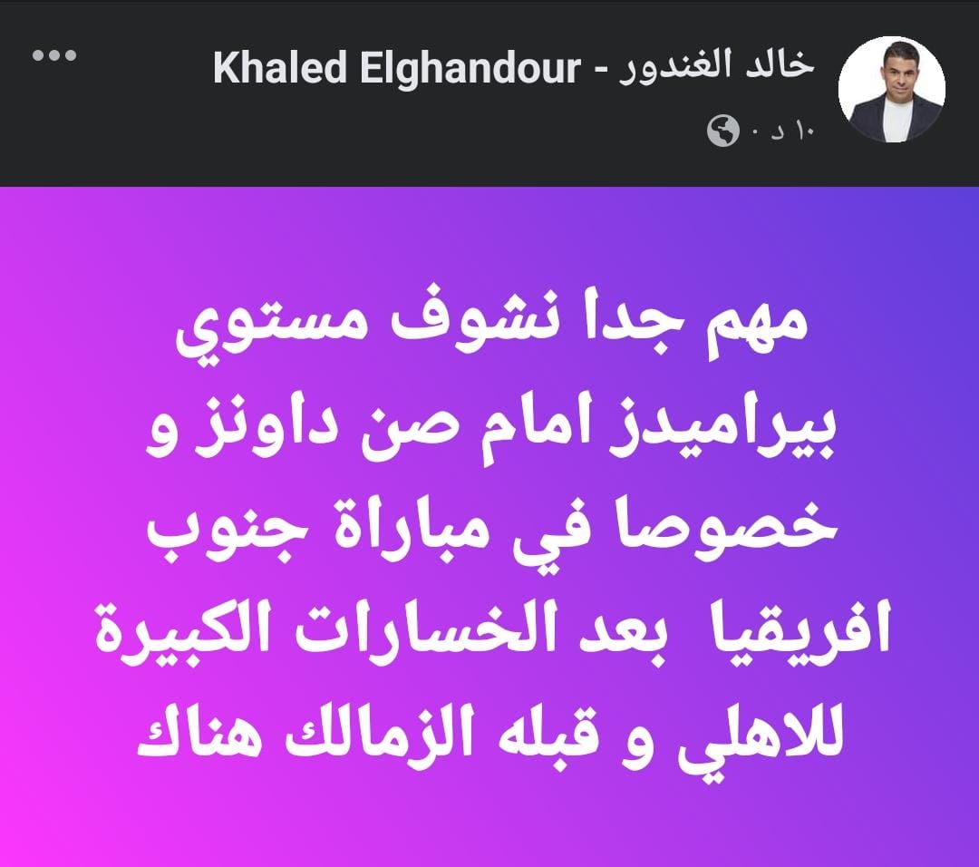 وكتب خالد الغندور عبر حسابه الرسمي على موقع التواصل الاجتماعي “فيس بوك”:”مهم جداً نشوف مستوى بيراميدز أمام صن داونز”.
