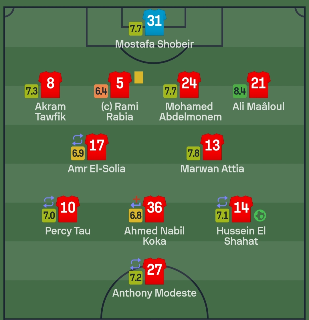 وحصل رامي ربيعة، على أسوأ تقييم بين لاعبي الاهلي بـ6.4، يليه أحمد نبيل كوكا بـ6.8.
