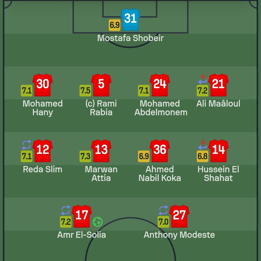وجاء تقييم الفرنسي أنتوني موديست في مباراة الاهلي ضد سيمبا 7.0، فيما كان حثل حسين الشحات على أقل تقييم في اللقاء بـ6.8، وأحمد عبد القادر ومصطفى شوبير على 6.9.