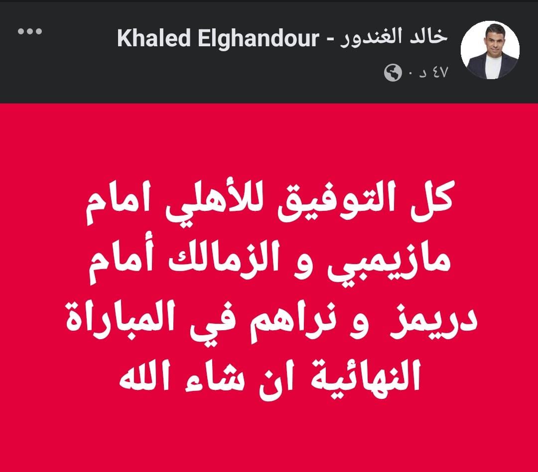 وكتب الغندور، عبر حسابه الرسمي على موقع التواصل الاجتماعي “فيس بوك”:”كل التوفيق للاهلي أمام مازيمبي والزمالك أمام دريمز و نراهم في المباراة النهائية إن شاء الله”.