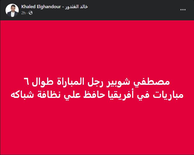 وكتب خالد الغندور عبر حسابه على موقع التواصل الاجتماعي “فيسبوك”: “مصطفي شوبير رجل المباراة طوال ٦ مباريات في أفريقيا حافظ علي نظافة شباكه”.