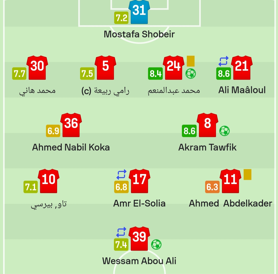 وحصل محمد عبد المنعم على تقييم 8.4، ويليه محمد هاني بـ7.7، ورامي ربيعة بـ7.5، ووسام أبو علي بـ7.4.