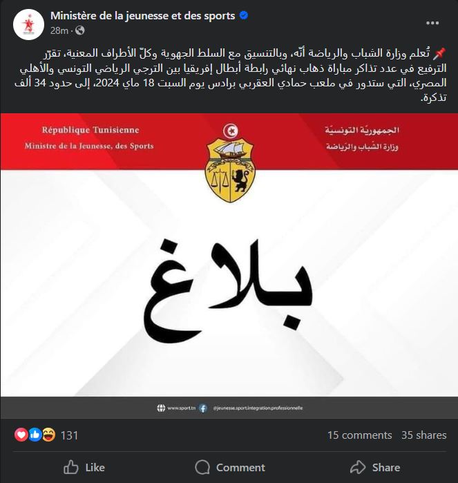 وأصدرت وزارة الشباب والرياضة التونسية، بيانًا، جاء فيه: “تُعلم وزارة الشباب والرياضة أنّه، وبالتنسيق مع السلط الجهوية وكلّ الأطراف المعنية، تقرّر الترفيع في عدد تذاكر مباراة ذهاب نهائي رابطة أبطال إفريقيا بين الترجي الرياضي التونسي والأهلي المصري، التي ستدور في ملعب حمادي العقربي برادس يوم السبت 18 ماي 2024، إلى حدود 34 ألف تذكرة”.