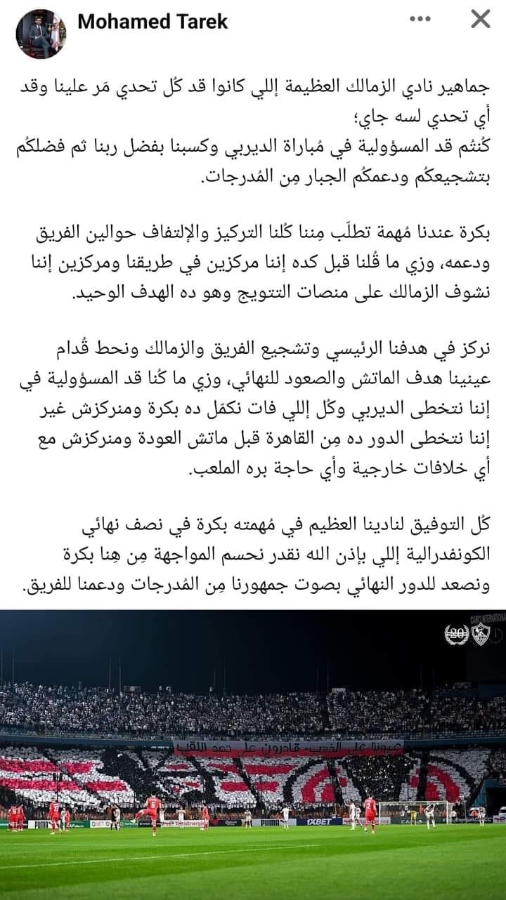 وقال طارق، عبر حسابه الرسمي على موقع التواصل الاجتماعي “فيسبوك”: “جماهير نادي الزمالك العظيمة إللي كانوا قد كُل تحدي مَر علينا وقد أي تحدي لسه جاي؛ كُنتُم قد المسؤولية في مُباراة الديربي وكسبنا بفضل ربنا ثم فضلكُم بتشجيعكُم ودعمكُم الجبار مِن المُدرجات.