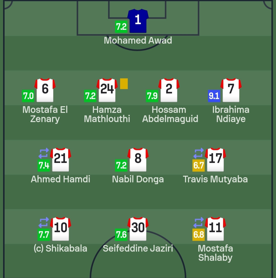 وحصل ترافيس موتيابا، على أسوأ تقييم بين لاعبي الزمالك بـ6.7، يليه مصطفى شلبي بـ6.8 درجة.