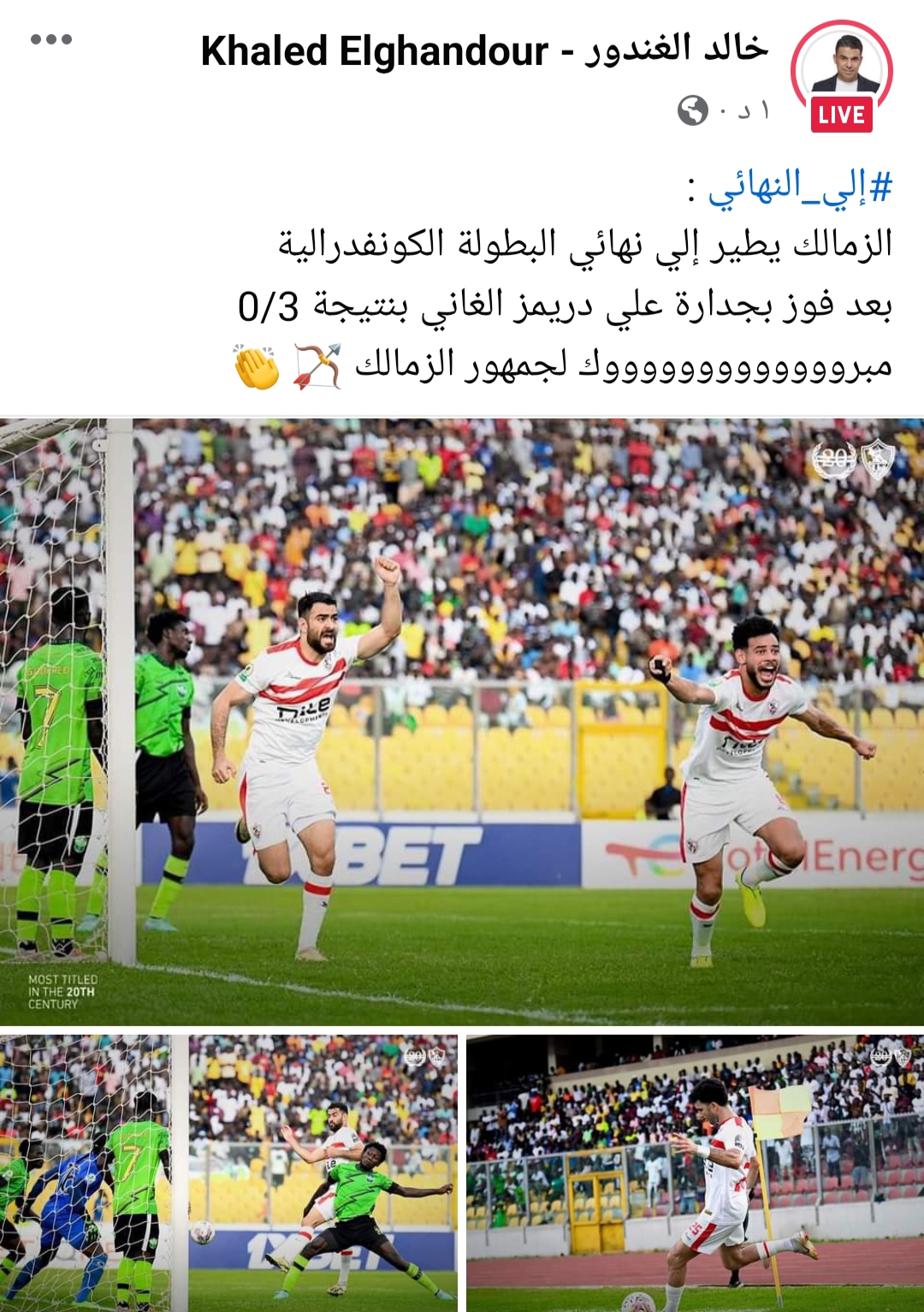 وكتب الغندور عبر حسابه الرسمي على موقع التواصل الاجتماعي “فيس بوك”: “الزمالك يطير إلي نهائي البطولة الكونفدرالية بعد فوز بجدارة علي دريمز الغاني بنتيجة 0/3”.