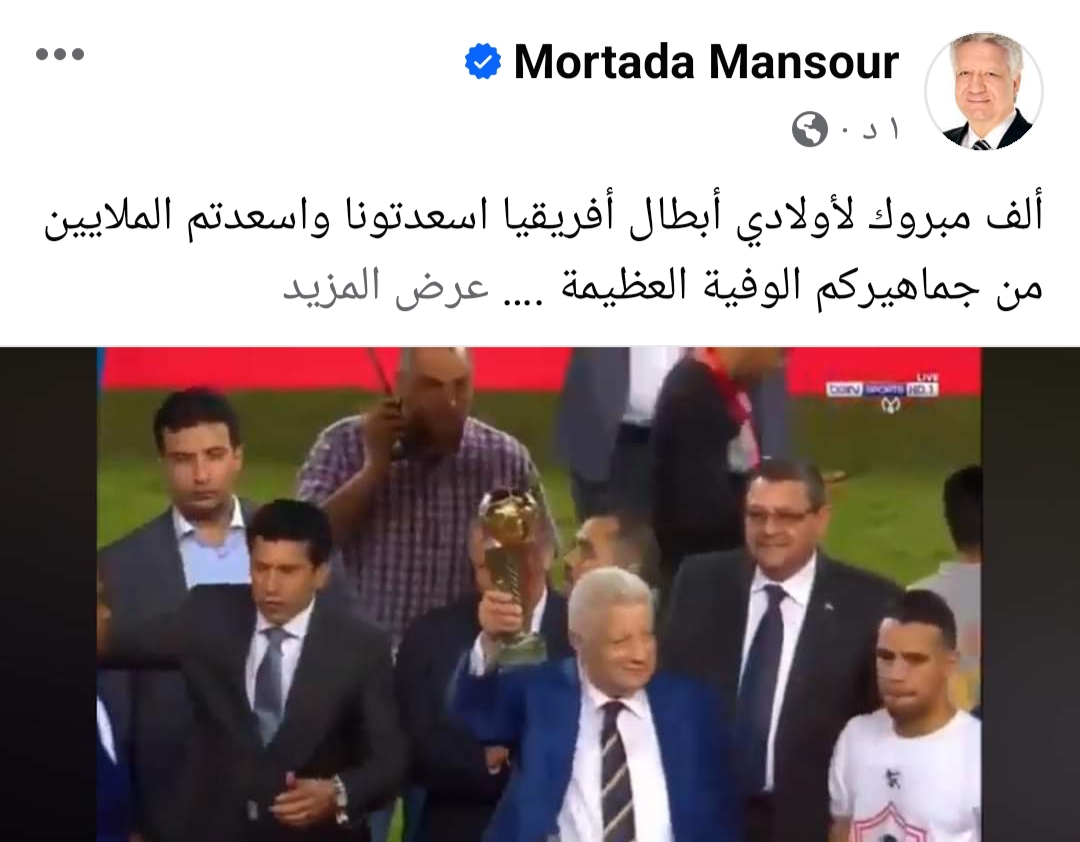 وكتب منصور عبر حسابه على موقع التواصل الاجتماعي “فيس بوك”: “ألف مبروك لأولادي أبطال أفريقيا اسعدتونا واسعدتم الملايين من جماهيركم الوفية العظيمة”.