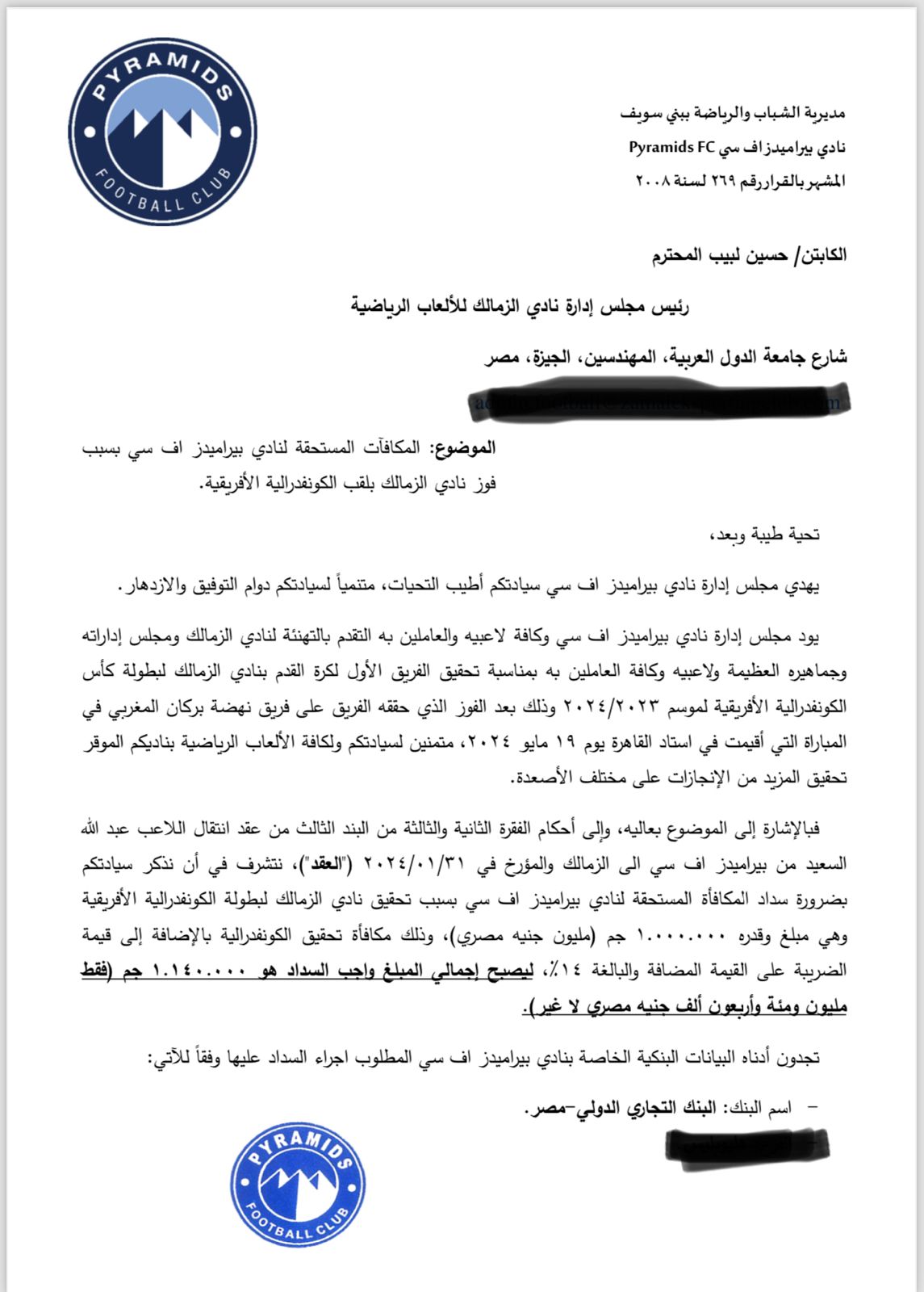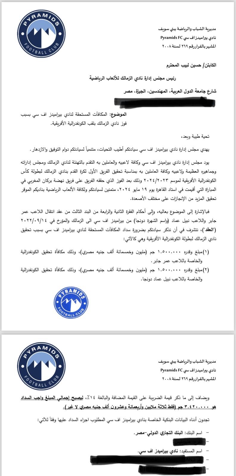 وواصل:”وفقا لأحكام الفقرة الثانية والثالثة من البند الثالث من عقد انتقال اللاعب عبد الله السعيد من بيراميدز إلى الزمالك والمؤرخ في 31/01/2024، نتشرف في أن نذكر سيادتكم بضرورة سداد المكافأة المستحقة لنادي بيراميدز بسبب تحقيق نادي الزمالك لبطولة كأس الكونفدرالية الأفريقية وهي مبلغ مليون جنيه مصري وذلك مكافأة تحقيق الكونفدرالية بالإضافة إلى قيمة الضريبة على القيمة المضافة، مليون و140 ألف جنيه”.