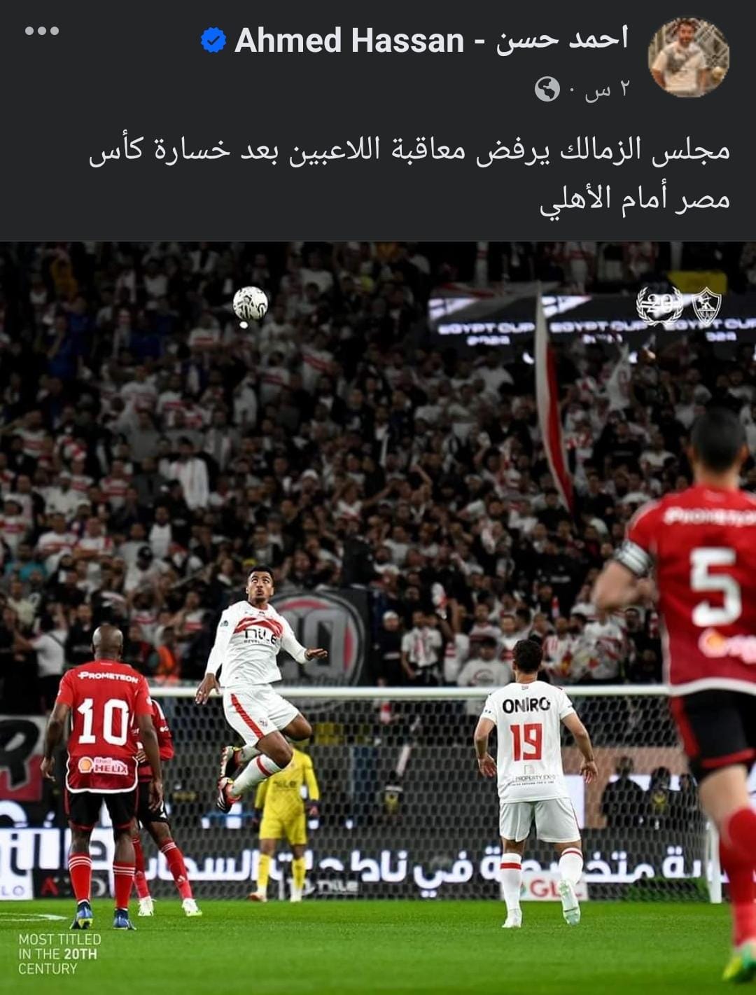وقال أحمد حسن، عبر حسابه الرسمي على موقع التواصل الاجتماعي “فيسبوك”: “مجلس الزمالك يرفض معاقبة اللاعبين بعد خسارة كأس مصر أمام الأهلي”.