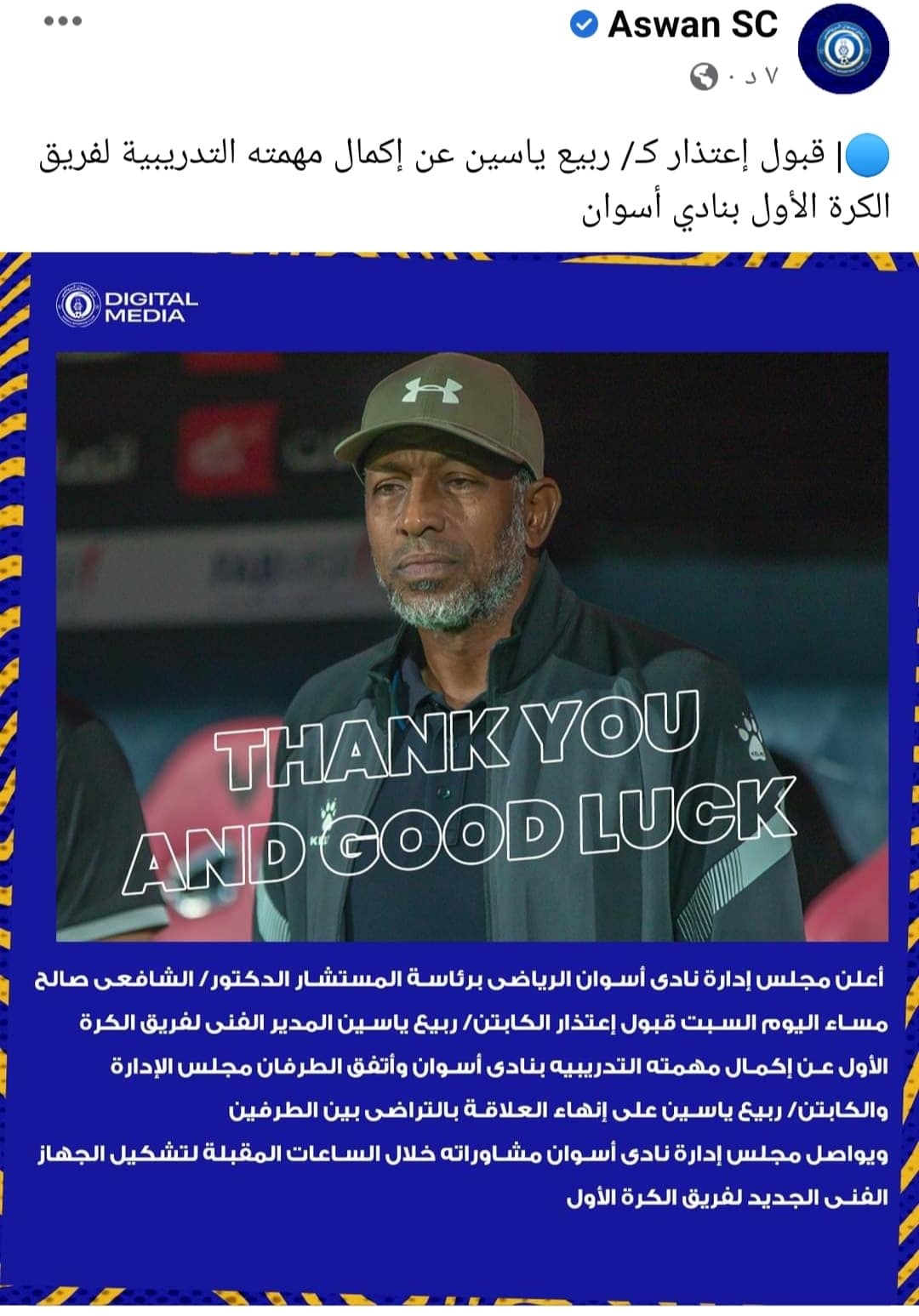 ونشر الحساب الرسمي لنادي أسوان عبر موقع التواصل الاجتماعي “فيس بوك” بيانًا كالتالي: “أعلن مجلس إدارة نادى أسوان الرياضى برئاسة المستشار الدكتور الشافعى صالح مساء اليوم السبت قبول إعتذار ربيع ياسين المدير الفنى لفريق الكرة الأول عن إكمال مهمته التدريبيه بنادى أسوان”.