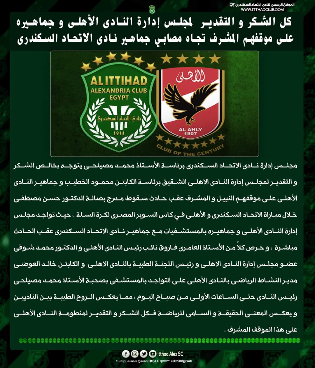 وجه مجلس إدارة نادي الاتحاد السكندري، رسالة شكر إلى إدارة النادي الأهلي، عقب أحداث صالة حسن مصطفى.