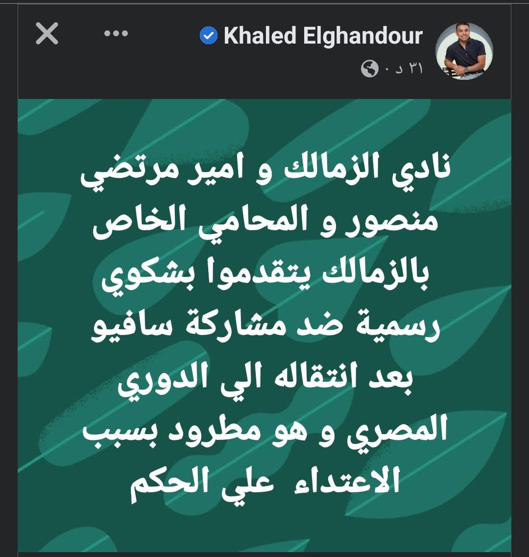 وكشف خالد الغندور في منشور عبر صفحته الرسمية على موقع التواصل الإجتماعي “فيسبوك”، عن تقدم نادي الزمالك بشكوى ضد البرازيلي برونو سافيو: “نادي الزمالك و امير مرتضي منصور و المحامي الخاص بالزمالك يتقدموا بشكوي رسمية ضد مشاركة سافيو بعد انتقاله الي الدوري المصري و هو مطرود بسبب الاعتداء علي الحكم.”