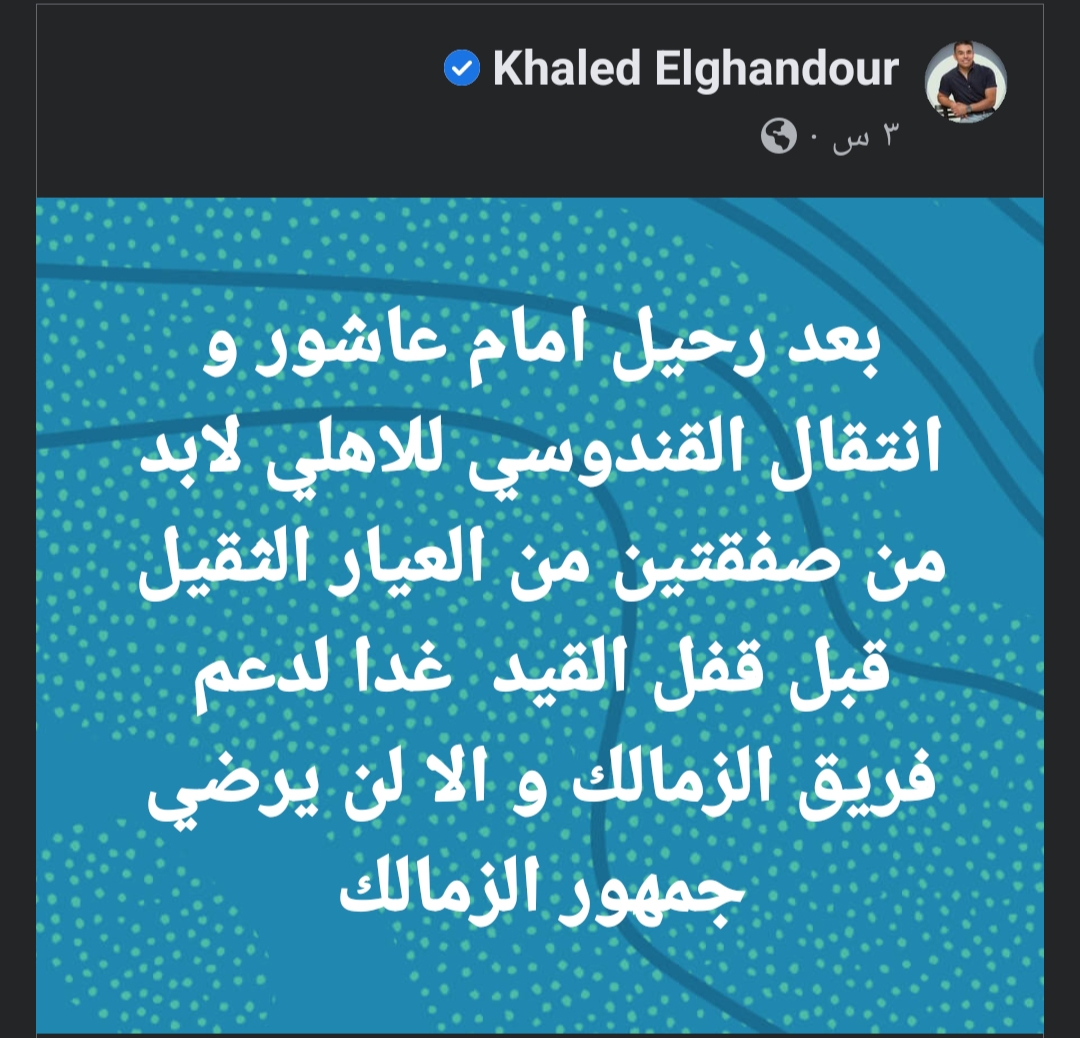 وكتب الغندور عبر حسابه الشخصي في موقع التواصل الاجتماعي «فيس بوك»: “بعد رحيل إمام عاشور وانتقال القندوسي لـ الأهلي لابد من صفقتين من العيار الثقيل قبل قفل القيد غدًا لدعم فريق الزمالك وإلا لن يرضى جمهور الزمالك”.