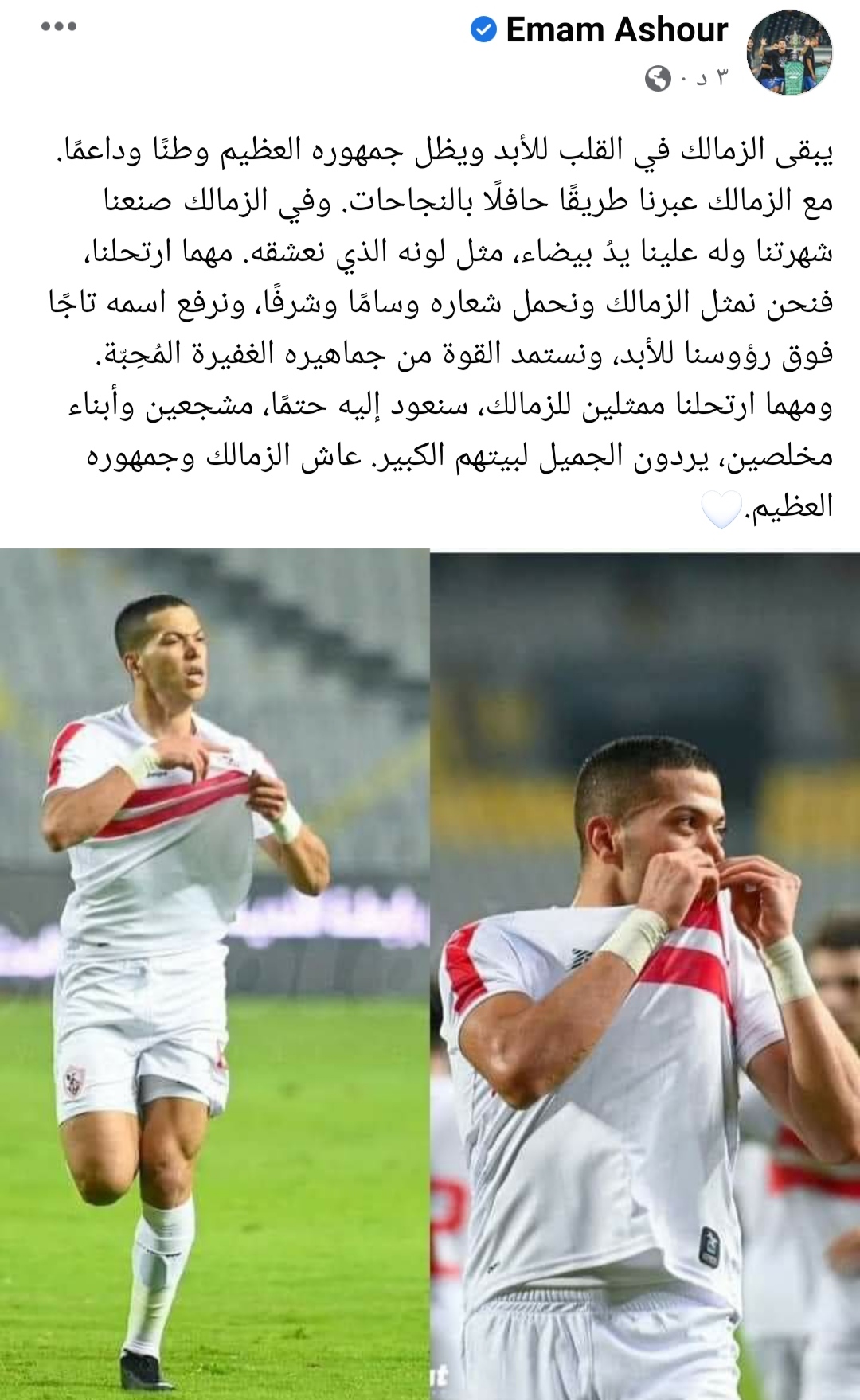 وكتب إمام عاشور عبر حسابه الخاص بموقع التواصل الاجتماعي “فيس بوك”: “يبقى الزمالك في القلب للأبد ويظل جمهوره العظيم وطنًا وداعمًا”.