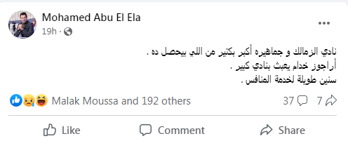وكتب محمد أبو العلا عبر حسابه الشخصي على موقع التواصل الاجتماعي «فيس بوك»: “نادي الزمالك وجماهيره أكبر بكتير من اللي بيحصل ده، أراجوز خدام يعبث بنادي كبير، سنين طويلة لخدمة المنافس”.