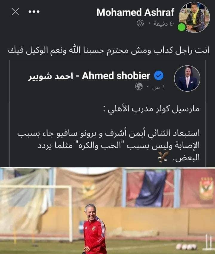 وتظهر الصورة المتداولة، أن شقيق أيمن أشرف قام بمشاركة تصريحات كولر من الصفحة الرسمية للإعلامي أحمد شوبير، وعلق عليها:”انت راجل كداب ومش محترم حسبنا الله ونعم الوكيل فيك”.