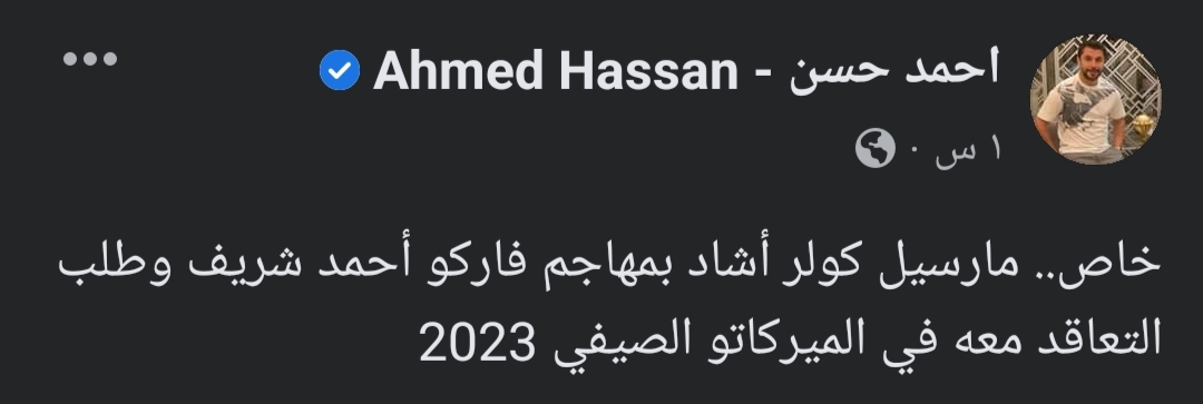 وكتب أحمد حسن، عبر حسابه الرسمي على موقع التواصل الاجتماعي “فيس بوك”:” خاص.. مارسيل كولر أشاد بمهاجم فاركو أحمد شريف وطلب التعاقد معه في الميركاتو الصيفي 2023″.
