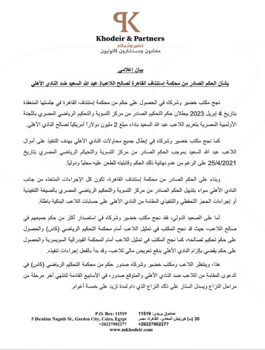 نجح مكتب خضير وشركاه في الحصول على حكم من محكمة استئناف القاهرة في جلستها المنعقدة بتاريخ 4 أبريل 2023 ببطلان حكم التحكيم الصادر من مركز التسوية والتحكيم الرياضي المصري باللجنة الأوليمبية المصرية بتغريم اللاعب عبدالله السعيد بأداء مبلغ 2 مليون دولار أمريكي لصالح النادي الأهلي.