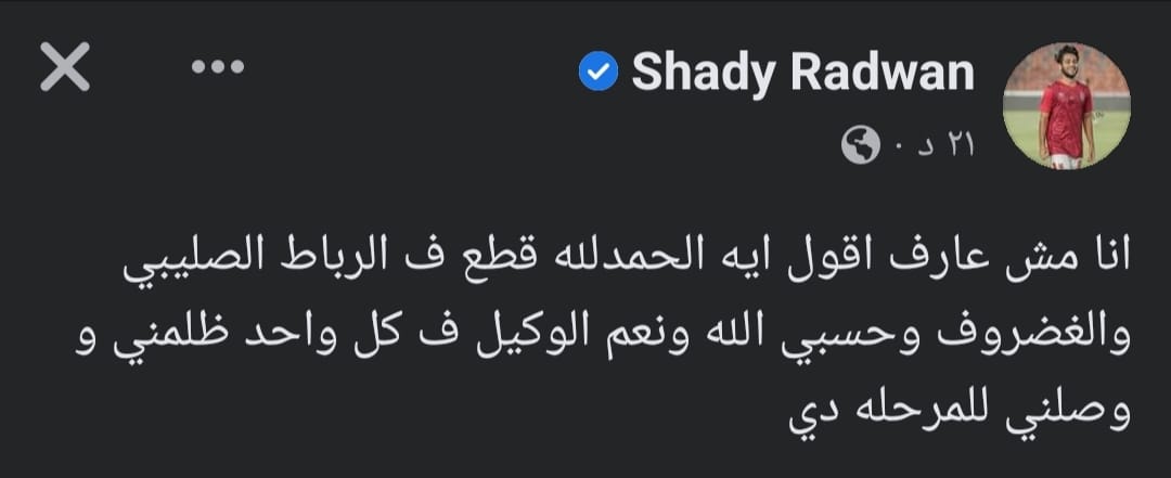 وعلق شادي رضوان على الإصابة عبر حسابه الرسمي على “فيس بوك” اليوم: “انا مش عارف اقول ايه الحمدلله قطع ف الرباط الصليبي والغضروف وحسبي الله ونعم الوكيل ف كل واحد ظلمني ووصلني للمرحلة دي”.