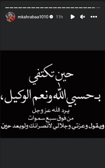 ونشر كهربا عبر حسابه الشخصي قائلا، “حين تكتفي بحسبي الله ونعم الوكيل.. يرد الله عز وجل من فوق سبع سماوات ويقول وعزتي وجلالي لأنصرنك ولو بعد حين”.
