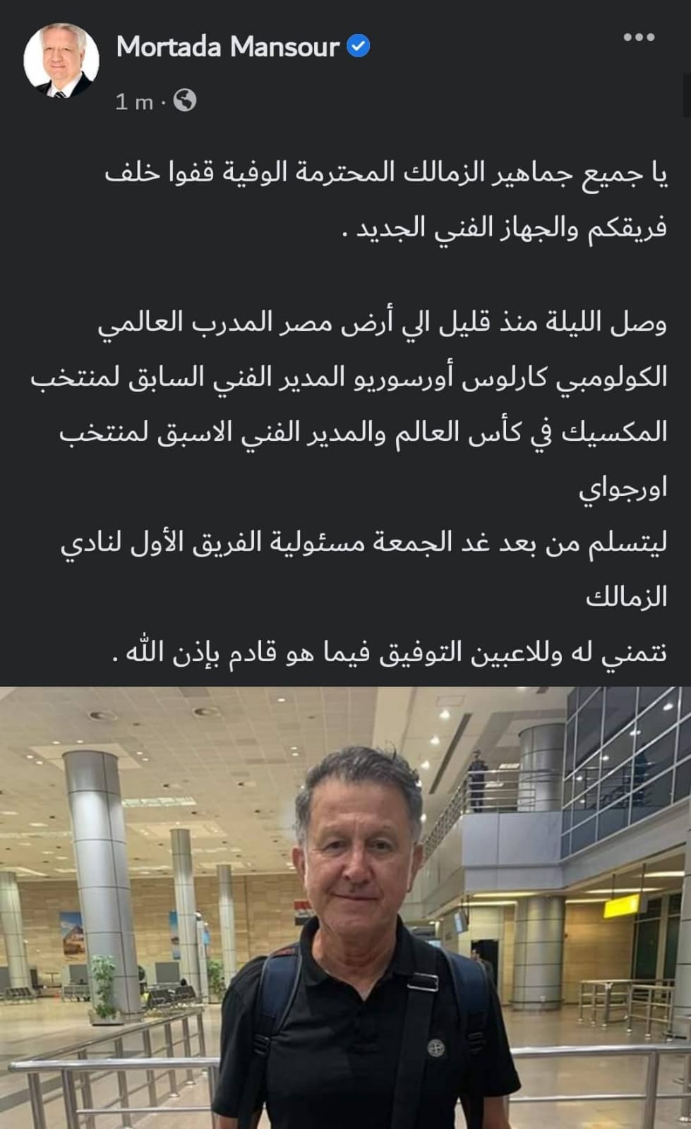 وتابع: “وصل الليلة منذ قليل إلى أرض مصر المدرب العالمي الكولومبي كارلوس أورسوريو المدير الفني السابق لمنتخب المكسيك في كأس العالم والمدير الفني الاسبق لمنتخب بارجواي، ليتسلم من بعد غد الجمعة مسئولية الفريق الأول لنادي الزمالك.