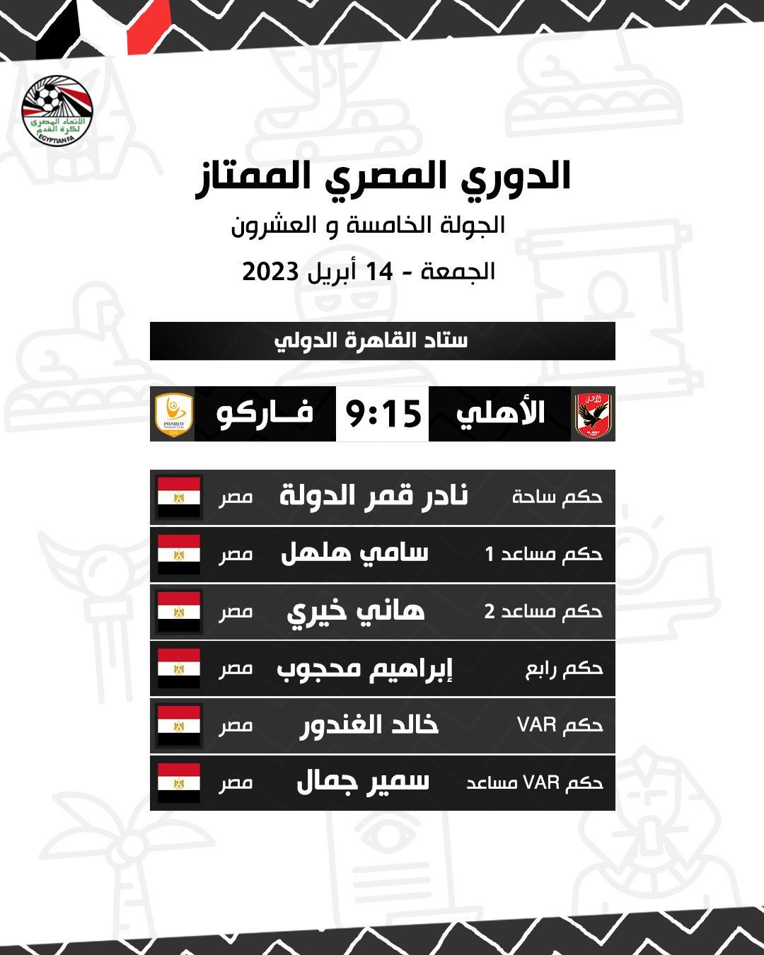 كشفت لجنة الحكام بالاتحاد المصري لكرة القدم عن حكم مباراة الأهلي وفاركو في مسابقة الدوري الممتاز.