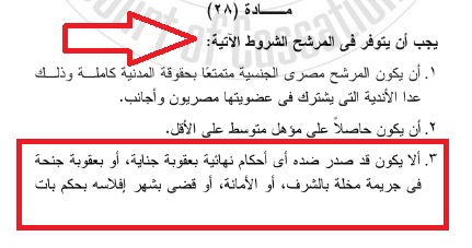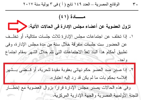 وتختلف الفقرة 3 من المادة 28 والتي حددت شروط الترشح بعدم صدور أحكام نهائية بعقوبة جنائية أو جنحة مخلة بالشرف أو الأمانة – ليس من ضمنها السب والقذف – ضد المترشح عن المادة 41 والتي تتحدث بشكل عن “عقوبة مقيدة للحرية” صدرت بحق أعضاء مجلس الإدارة.