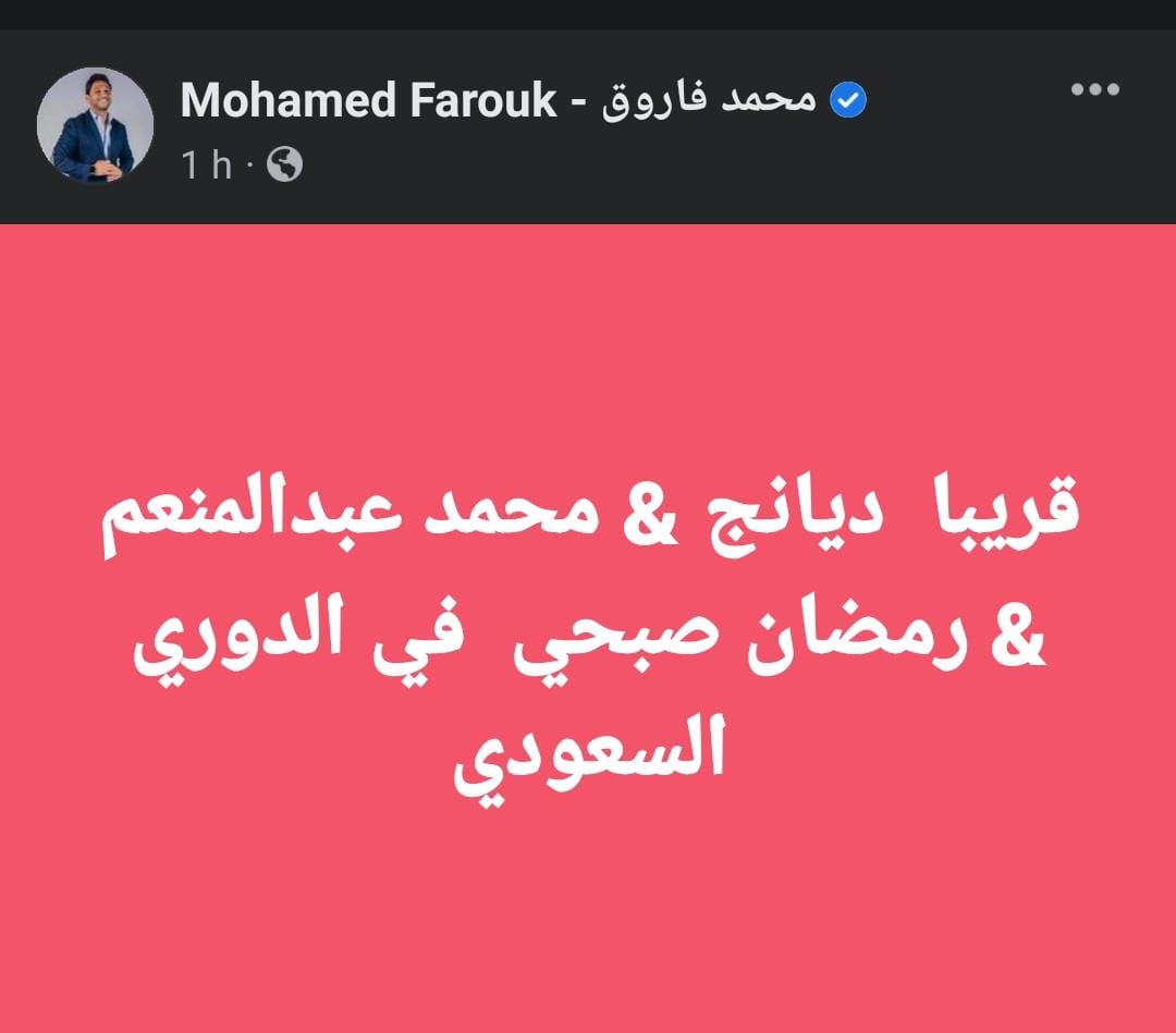 وكتب محمد فاروق، عبر صفحته الرسمية على موقع التواصل الاجتماعي”فيس بوك”:”قريبا ديانج، محمد عبدالمنعم، رمضان صبحي في الدوري السعودي”.