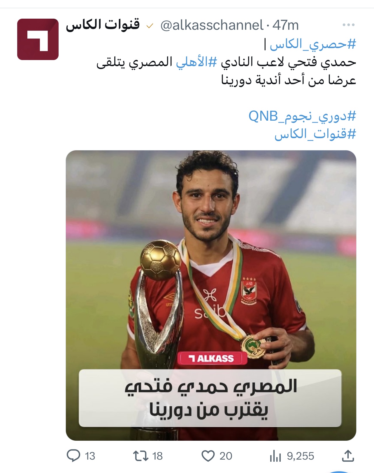 ونشرت قناة الكأس عبر حسابها الرسمي على موقع التواصل الاجتماعي «تويتر»: «حمدي فتحي، لاعب النادي الأهلي المصري، يتلقى عرضًا من أحد أندية دورينا».
