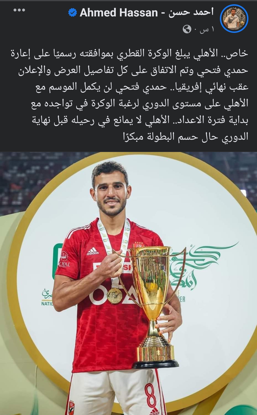 وكتب أحمد حسن عبر حسابه الرسمي على موقع التواصل الاجتماعي “فيس بوك”:”خاص.. الأهلي يبلغ الوكرة القطري بموافقته رسميًا على إعارة حمدي فتحي وتم الاتفاق على كل تفاصيل العرض والإعلان عقب نهائي إفريقيا”.