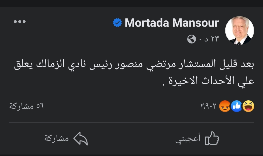 وكتب رئيس القلعة البيضاء السابق، عبر حسابه الرسمي على “فيس بوك”:”بعد قليل المستشار مرتضى منصور رئيس نادي الزمالك يعلق على الأحداث الأخيرة”.