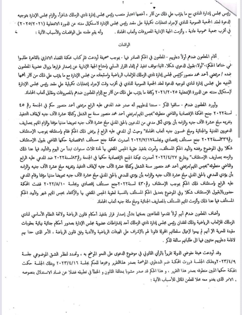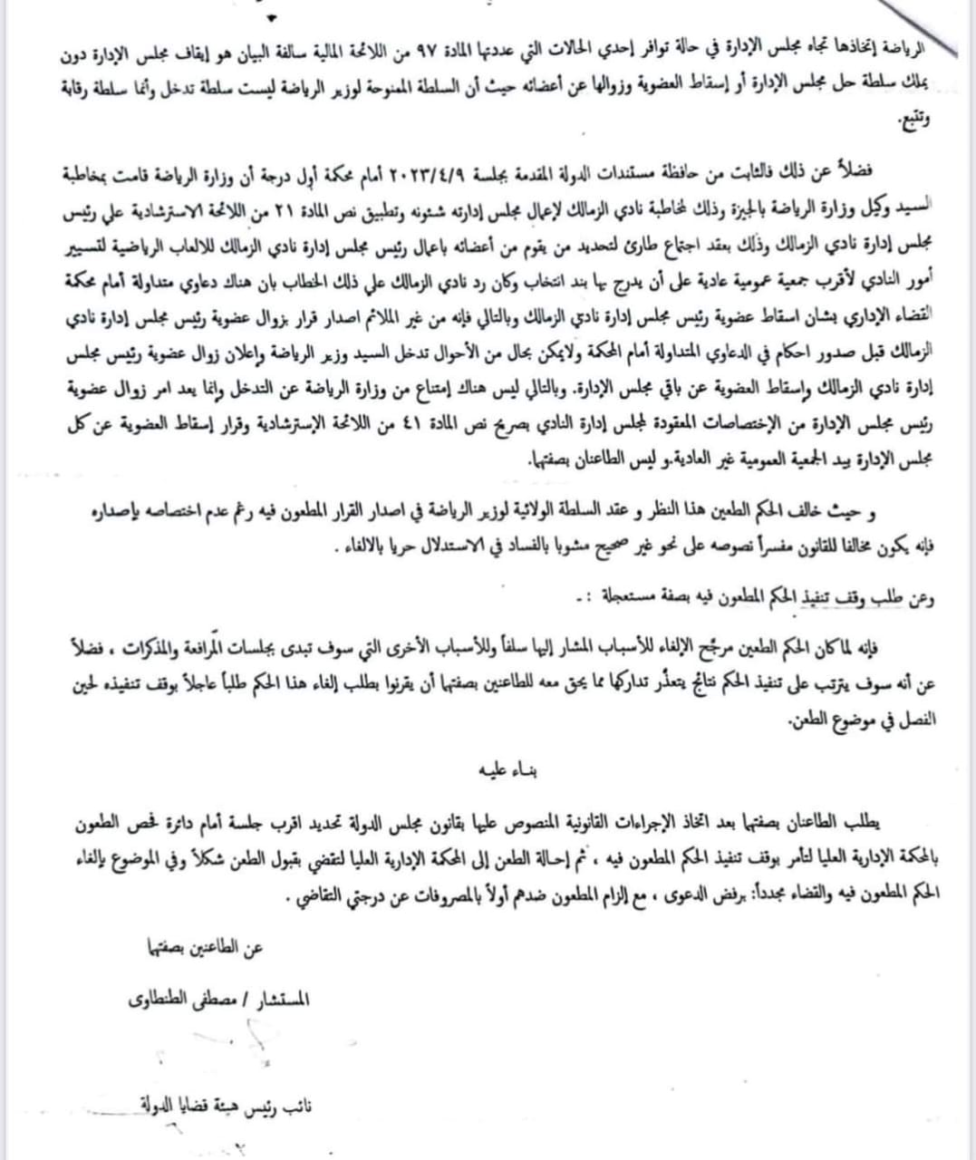 وتم تقديم الطعن صباح اليوم الأحد الموافق 5-6-2023، أمام المحكمة الإدارية العليا، على الحكم الصادر بعزل مرتضى منصور، وأنها ليست صاحبة الحق في عزل رئيس نادي من منصبه، والجمعية العموميه هي صاحبة الحق الأصيل في اتخاذ ها القرار.