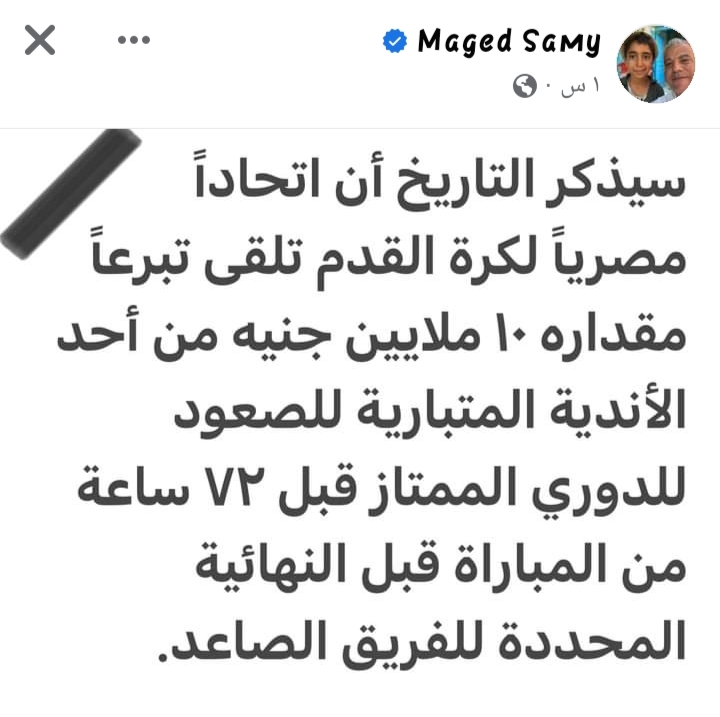 وكتب ماجد سامي عبر حسابه الرسمي على موقع التواصل الاجتماعي فيس بوك، اليوم الأربعاء: “سيذكر التاريخ أن اتحادًا مصريًا لكرة القدم تلقى تبرعًا من أحد الأندية المتبارية للصعود للدوري المصري الممتاز قبل 72 ساعة من المباراة قبل النهائية والمحددة للفريق الصاعد”.