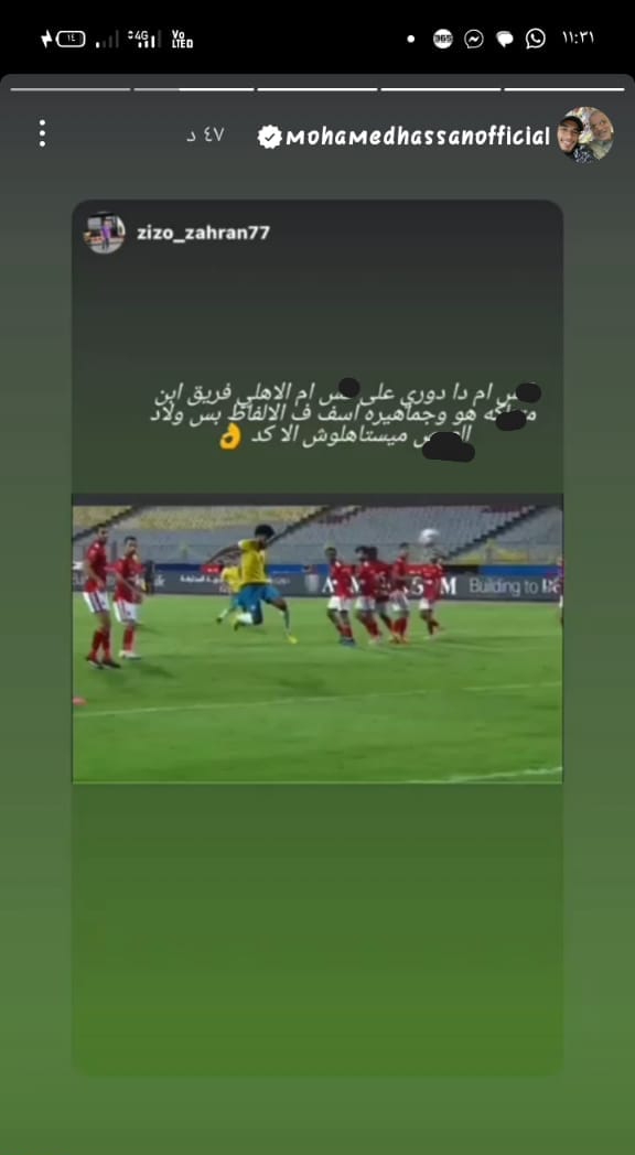 ونشر محمد حسن، فيديو عبر حسابه الرسمي على موقع التواصل الاجتماعي انستجرام، يقوم من خلاله بسب النادي الاهلي وجماهيره.