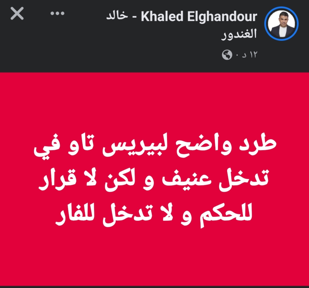 وكتب خالد الغندور، عبر حسابه الرسمي على موقع التواصل الاجتماعي “فيس بوك” طرد واضح لبيرسي تاو في تدخل عنيف و لكن لا قرار للحكم و لا تدخل للفار”.