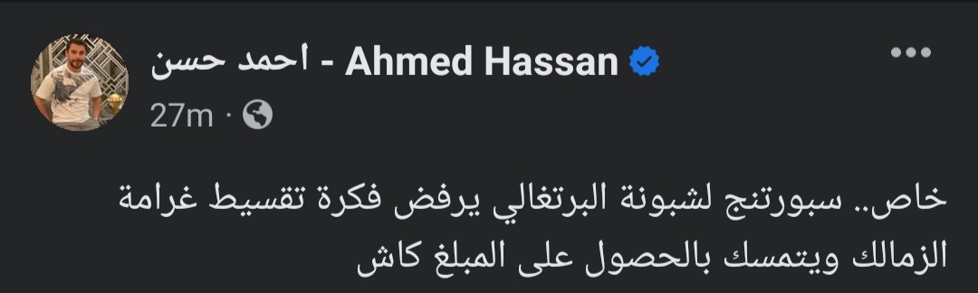 وكتب أحمد حسن نجم منتخب مصر السابق، عبر حسابه الشخصي على موقع التواصل الإجتماعي فيسبوك: “خاص.. سبورتنج لشبونة البرتغالي يرفض فكرة تقسيط غرامة الزمالك ويتمسك بالحصول على المبلغ كاش”.