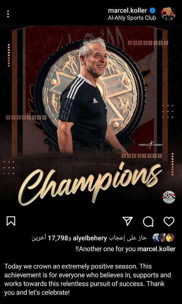 وكتبت مارسيل كولر عبر حسابه الشخصي على موقع التواصل الإجتماعي إنستجرام: “لقب آخر من أجلكم!، اليوم نتوج موسمًا إيجابيًا للغاية بالبطولة الأغلى”.
