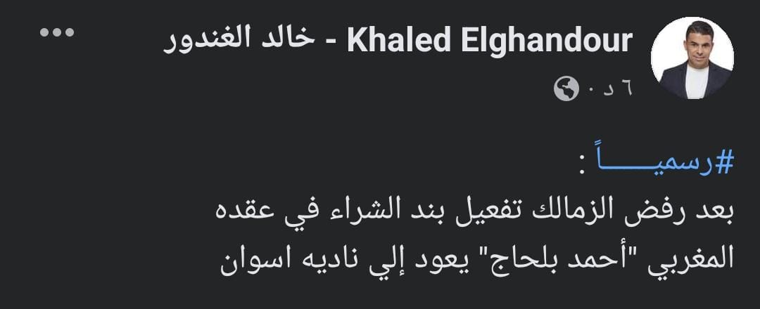 وكتب الغندور عبر حسابه الرسمي على موقع التواصل الاجتماعي “فيس بوك”:”بعد رفض الزمالك تفعيل بند الشراء في عقد المغربي أحمد بلحاج يعود إلى ناديه أسوان”.