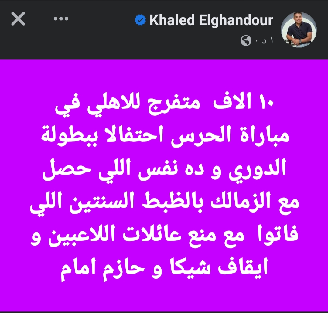 وكتب الغندور عبر حسابه الرسمي على موقع التواصل الاجتماعي “فيس بوك”:”10 آلاف متفرج للاهلي في مباراة الحرس احتفالا ببطولة الدوري، و ده نفس اللي حصل مع الزمالك بالظبط السنتين اللي فاتوا مع منع عائلات اللاعبين و إيقاف شيكا و حازم إمام”.