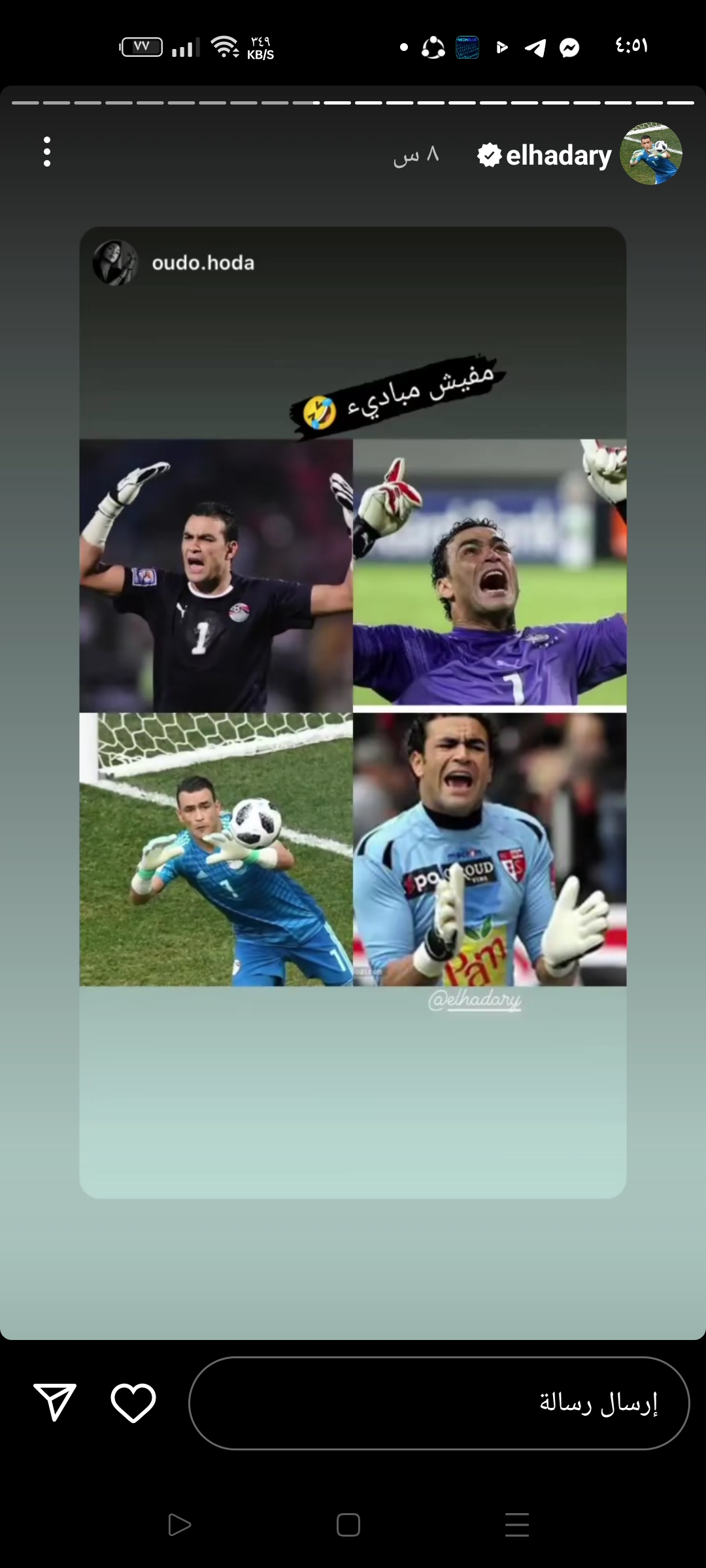 وقام الحضري بإعادة نشر الاستوري الخاص بأحد متابعيه عبر حسابه الشخصي على موقع «إنستجرام» ونشر صورتين له وهو يؤدي التدريبات الرياضية وعلق عليها بـ«مفيش مباديء».