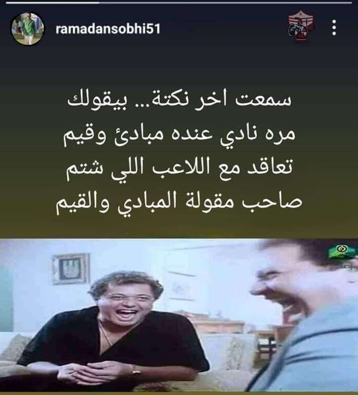 وتضمنت الصورة سخرية من النادي الاهلي بعد التعاقد مع إمام عاشور، حيث نشر رمضان صبحي مشهد من فيلم “الكيف” وعلق عليها بـ”سمعت آخر نكتة، بيقولك مرودة نادي عنده مبادئ وقيم تعافد مع اللاعب اللي شتم ثاخب مقولة المبادئ والقيم”.
