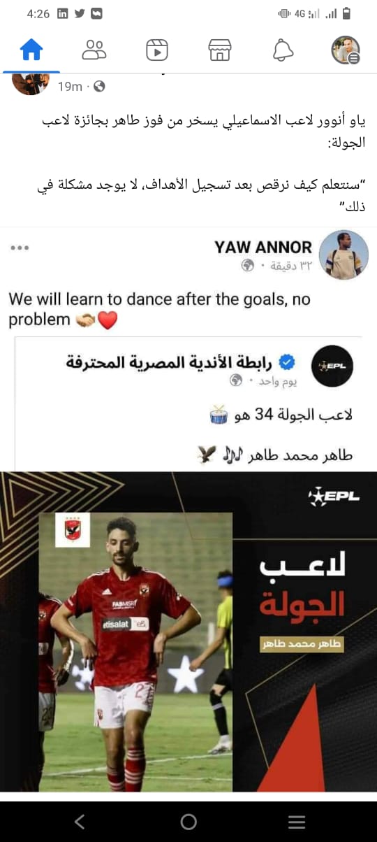 ونشر ياو أنور خبر تتويج طاهر محمد طاهر بجائزة أفضل لاعب في الجولة 34 من الدوري المصري عبر حسابه الرسمي على موقع “فيسبوك”.