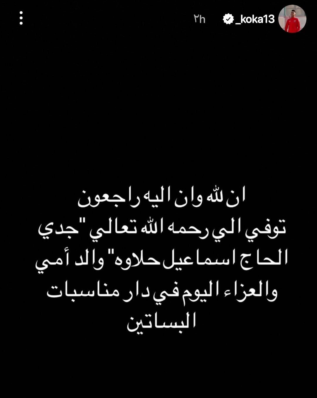 وأضاف لاعب النادي الاهلي:” والعزاء اليوم في دار مناسبات البساتين “.