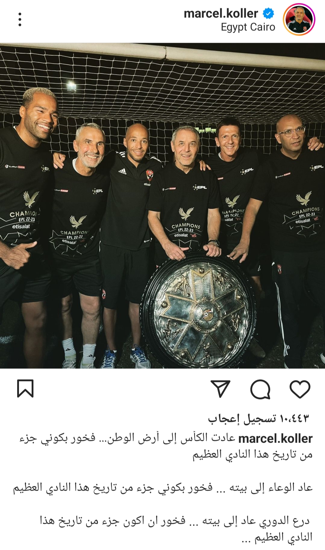 ونشر كولر مدرب الاهلي صورة له عبر حسابه الشخصي على موقع التواصل الاجتماعي “انستجرام” وبجانبه درع الدوري الممتاز وعلق عليها قائلا “عاد الكأس إلى وطنه .. فخور بأن أكون جزءًا من تاريخ هذا النادي العظيم”.