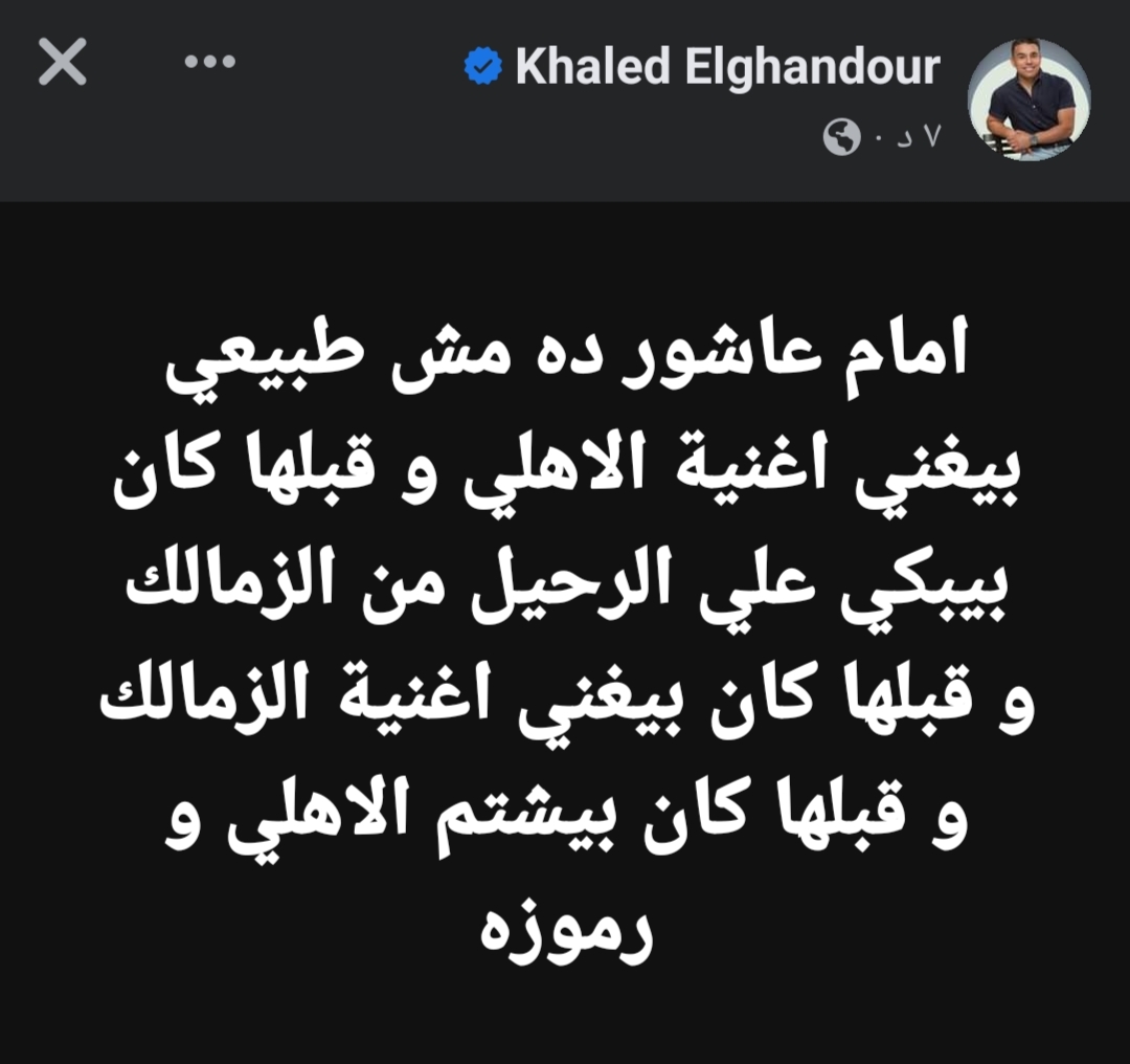 وكتب خالد الغندور، عبر حسابه الرسمي على موقع التواصل الاجتماعي “فيس بوك”:”إمام عاشور ده مش طبيعي بيغني أغنية الاهلي و قبلها كان بيبكي على الرحيل من الزمالك و قبلها كان بيغني أغنية الزمالك و قبلها كان بيشتم الاهلي و رموزه”.