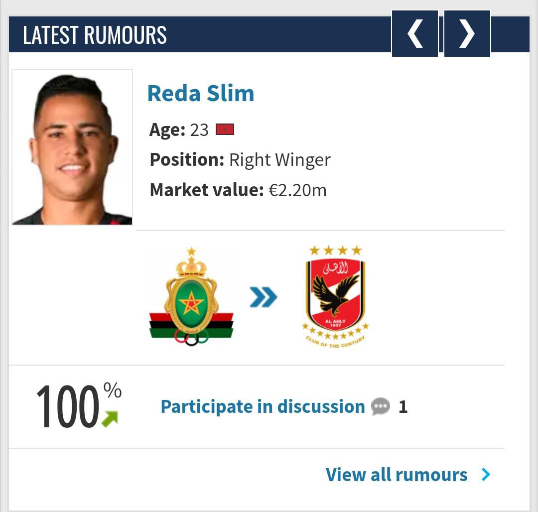 وأعلن موقع “ترانسفير ماركت” العالمي إتمام الاهلي تعاقده مع المغربي رضا سليم جناح فريق الجيش الملكي بنسبة 100% ليدافع عن ألوان الفريق بالموسم الجديد.