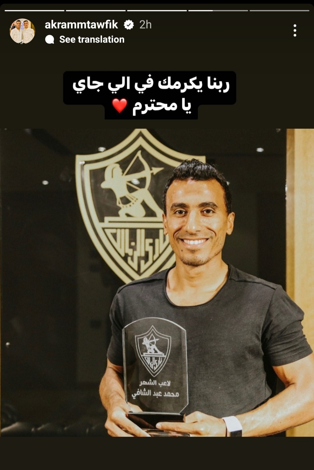 وكتب أكرم توفيق عبر خاصية الاستوري على حسابه الشخصي على موقع التواصل الإجتماعي إنستجرام: “ربنا يكرمك في اللي جاي يا محترم”.