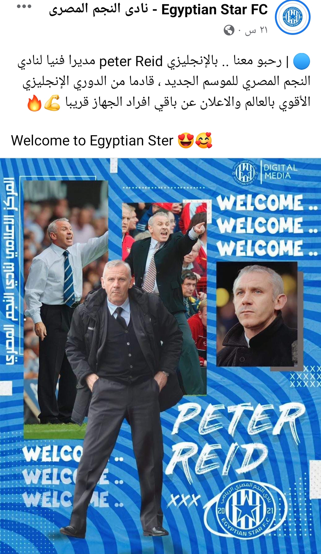 وكتب الحساب الرسمي لنادي النجوم المصري عبر موقع التواصل الاجتماعي “فيس بوك”: “رحبو معنا .. بالإنجليزي peter Reid مديرا فنيا لنادي النجم المصري للموسم الجديد، قادما من الدوري الإنجليزي الأقوي بالعالم والإعلان عن باقي افراد الجهاز قريبا”.